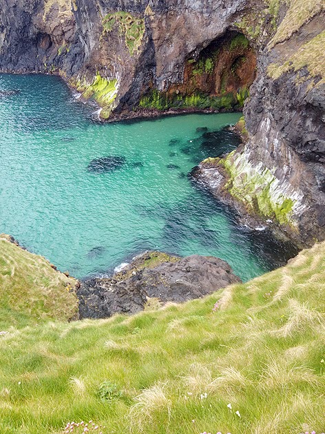 Seguimos pela costa parando para aproveitar as paisagens e passar uma ponte de corda para chegar à ilha de Carrickarede. A vista é espectacular, a água é azul esverdeada clara e cristalina, apesar de começar a chover não tira a vontade de tirar fotografias e passear por ali.
